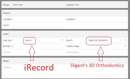 2) Next enter name of the patient, selects iRecord as the case type and select Digant’s 3D orthodontics lab in the the send to option.